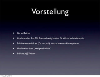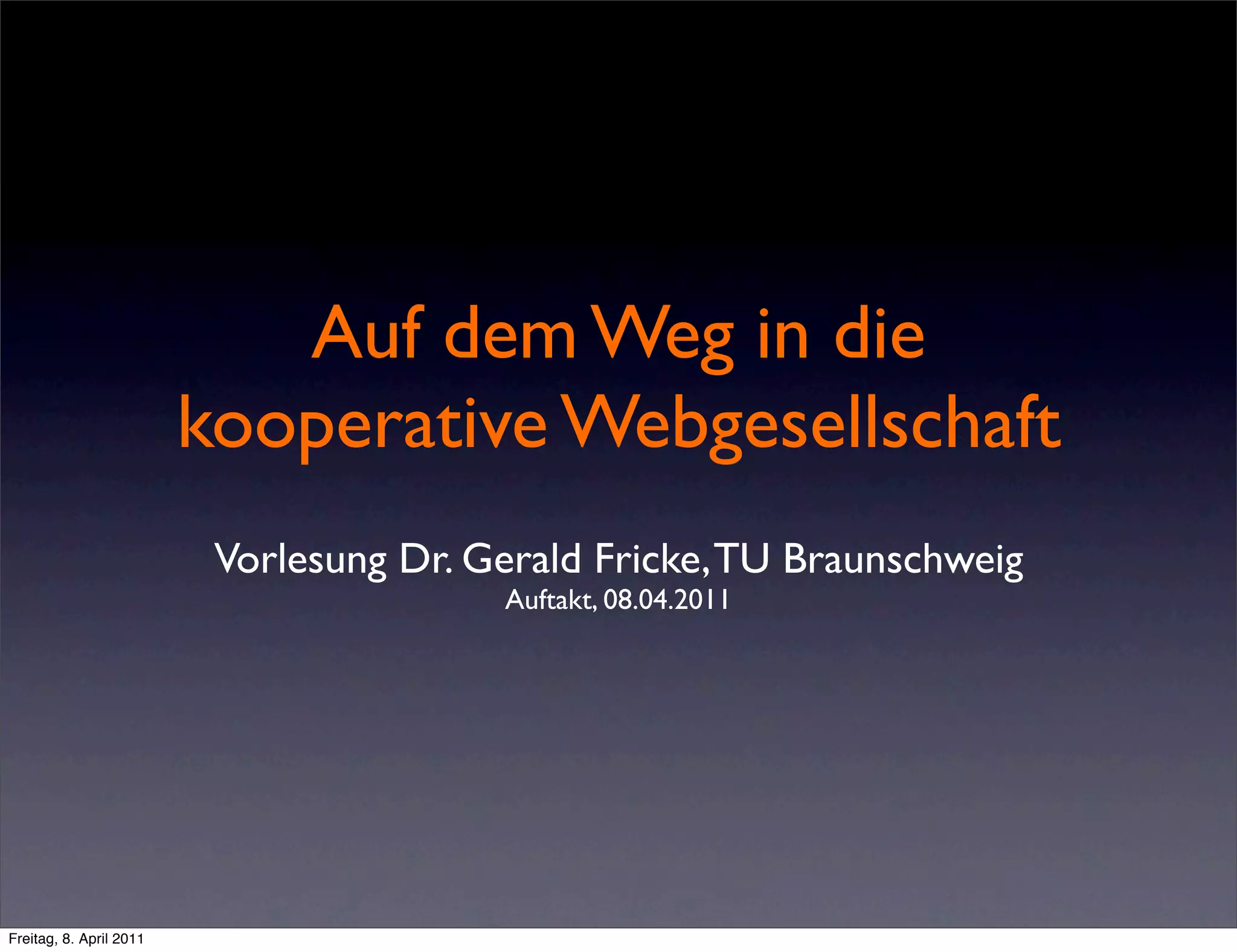 Die Vorlesung von Dr. Gerald Fricke an der TU Braunschweig behandelt die Veränderungen der Gesellschaft durch das Web und die Entwicklung neuer Normen und Kooperationsformen. Ziel ist es, wirtschaftsinformatik mit sozial- und medienwissenschaftlichen Theorien zu verknüpfen und die Kommunikation sowie Geschäftsmodelle im Internet zu analysieren. In Gruppenarbeiten sollen Thesen formuliert und kreativ präsentiert werden, während verschiedene Themen zur Webgesellschaft diskutiert werden.