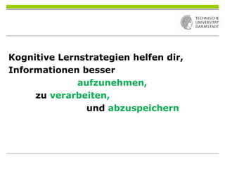 Kognitive Lernstrategien sind entscheidend für das effektive Aufnehmen, Verarbeiten und Speichern von Informationen und werden in fünf Gruppen unterteilt: Organisationsstrategien, Elaborationsstrategien, Wiederholungsstrategien, kritisches Prüfen und Wissensnutzungsstrategien. Bei der Anwendung von Lernstrategien ist es wichtig, die jeweiligen Aufgabenstellungen sowie persönliche Gefühle, Ziele und Motivation zu berücksichtigen. Es ist zu beachten, dass keine einzelne Lernstrategie für alle Situationen geeignet ist.