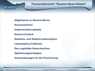 Das Dokument beschreibt die Grundlagen und Implementierungsdetails von Session-Beans in Enterprise Java Beans 3.1, einschließlich der Unterschiede zwischen stateless und stateful Varianten, ihrer Lebenszyklen sowie der Funktionsweise des Session-Contexts. Es erläutert auch die Verwendung von Annotations zur Deklaration von Transaktionen und Berechtigungen sowie Optimierungsstrategien wie Passivierung und Pooling. Zu den Herausforderungen gehören die Verwaltung des conversational state und die Notwendigkeit zur Serialisierbarkeit von beans für die Passivierung.