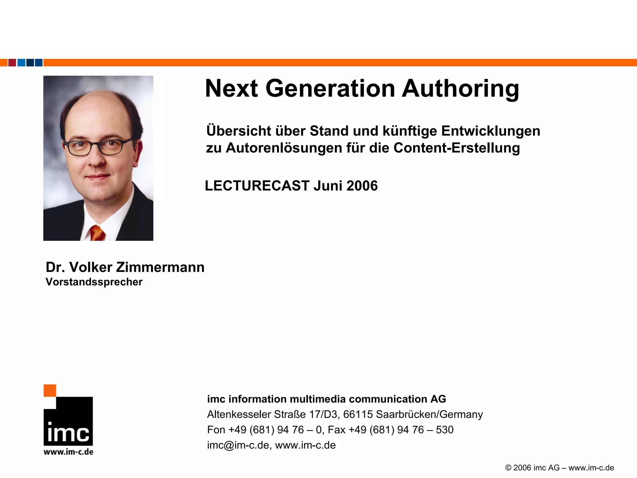 Das Dokument behandelt die aktuellen und zukünftigen Entwicklungen von Autorentools für die Content-Erstellung im deutschsprachigen Markt. Es zeigt auf, was Anwender in der Content-Produktion benötigen, darunter einfache Bedienbarkeit, Modularität und geringe Produktionskosten, sowie den Trend zur Integration von Autorensystemen innerhalb einer umfassenden Plattform. Des Weiteren wird auf künftige Standards und Lösungen hingewiesen, die eine effiziente Zusammenarbeit und Inhalte für verschiedene Formate unterstützen.