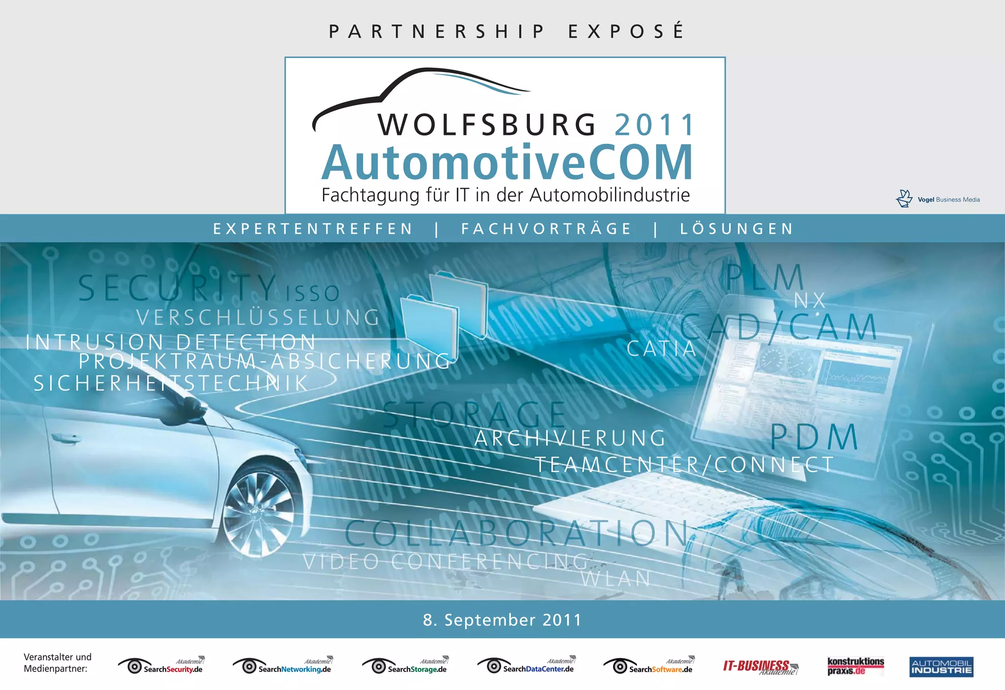 Die Fachtagung "automotivecom" in Wolfsburg am 8. September 2011 bietet IT-Entscheidern der Automobilbranche die Möglichkeit, sich über aktuelle Entwicklungen und Lösungen in den Bereichen IT-Sicherheit, PDM/PLM, Virtualisierung und Archivierung auszutauschen. Die Veranstaltung fokussiert sich auf den Bedarf an spezifischen IT-Lösungen, die den hohen Sicherheitsanforderungen der OEM-Partner entsprechen, und fördert den direkten Dialog zwischen Anbietern und Entscheidungsträgern. Durch eine Bedarfsanalyse und Workshops werden maßgeschneiderte Lösungen entwickelt und präsentiert.