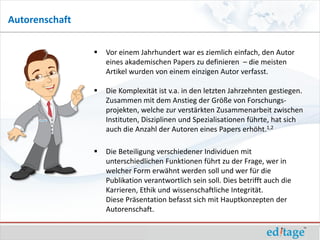 Das Dokument behandelt die komplexe Definition von Autorenschaft in wissenschaftlichen Publikationen, die durch zunehmende interdisziplinäre Kooperation und eine steigende Anzahl von Autoren komplizierter geworden ist. Es erläutert die Kriterien für die Autorenschaft gemäß den Richtlinien des International Committee of Medical Journal Editors (ICMJE) und hebt die Bedeutung der Reihenfolge der Autoren hervor, die oft zu Streitigkeiten führen kann. Zudem werden unethische Praktiken in Bezug auf Autorenschaft angesprochen, um die wissenschaftliche Integrität zu wahren.