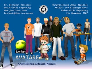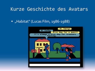 Das Dokument behandelt die Entwicklung und Verwendung von Avataren in virtuellen Umgebungen und deren kulturelle sowie subkulturelle Inszenierung. Es verweist auf verschiedene bedeutende Beispiele und Theorien, die die Interaktion und die sozialen Normen dieser digitalen Repräsentationen beleuchten. Abschließend wird die Notwendigkeit unterstrichen, die mediale Umgebung und Möglichkeiten der Partizipation im Detail zu analysieren.