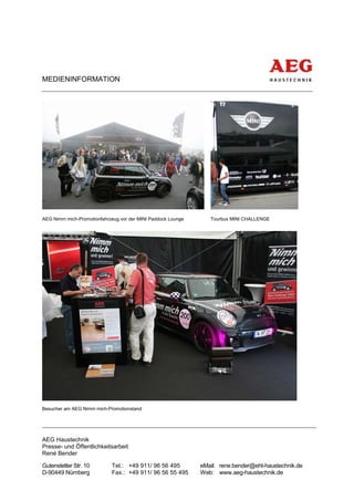 AEG Haustechnik war Hauptsponsor der Mini Challenge beim AVD Oldtimer Grand Prix am Nürburgring am 08.-09.08.2009, wo spannende Rennen und Lifestyle-Events stattfanden. Besucher interessierten sich für die AEG Nimm Mich-Promotion, und der drittplatzierte Rennfahrer Nico Bastian zeigte sich begeistert von der Aktion. Eine Zusammenfassung des Rennwochenendes wird am 15.08.2009 um 20:00 Uhr auf DSF ausgestrahlt.