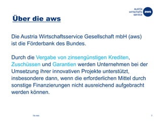 Die Austria Wirtschaftsservice Gesellschaft mbH (aws) ist die Förderbank des Bundes, die Unternehmen durch zinsgünstige Kredite, Zuschüsse und Garantien bei innovativen Projekten unterstützt, insbesondere in der Vorgründungs- und Gründungsphase. Sie bietet verschiedene Förderungsinstrumente, darunter Preseed und Seedfinancing, um technologische und kreative Unternehmen in Österreich zu unterstützen. Im Jahr 2012 wurden über 5.300 Förderzusagen erteilt, wodurch zahlreiche Arbeitsplätze neu geschaffen oder gesichert wurden.