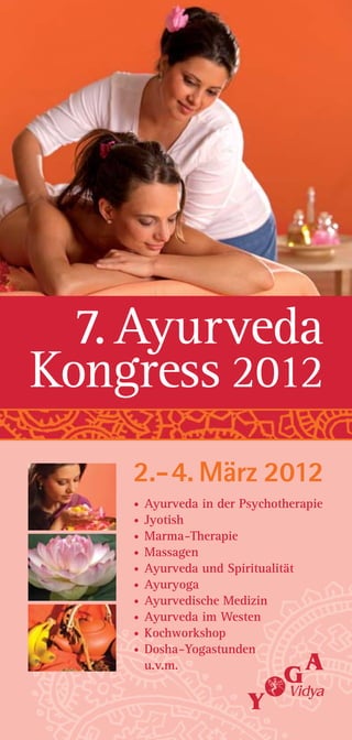 Der Ayurveda Kongress 2012, der vom 2. bis 4. März in Bad Meinberg stattfindet, richtet sich sowohl an Laien als auch an Fachleute und bietet ein umfangreiches Programm zu Themen wie Ayurveda in Psychotherapie, Yoga, Marma-Therapie und mehr, präsentiert von über 30 Experten. Ziel des Kongresses ist es, ein gemeinsames Verantwortungsbewusstsein in der Ayurveda-Gemeinschaft zu fördern und die Akzeptanz von Ayurveda in der Gesellschaft zu erhöhen. Durch Workshops, Vorträge und Yogastunden können Teilnehmer praktische Anwendungen und Methoden kennenlernen, um ihre Gesundheit zu verbessern und zu verstehen.