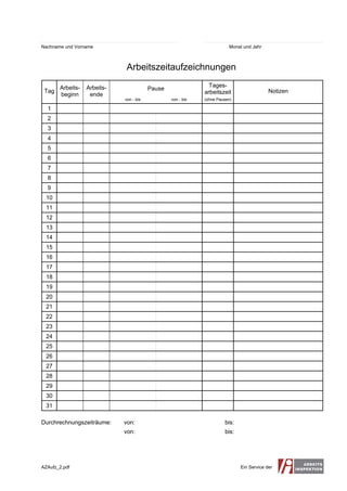 Das Dokument enthält Arbeitszeitaufzeichnungen, die Details zu Arbeitszeiten, Pausen und Notizen für einen bestimmten Monat und Zeitraum festhalten. Es bietet Platz für Angaben zu Beginn und Ende der Arbeitszeiten sowie für durchgeführte Arbeiten. Zudem wird auf den Service verwiesen, der die Arbeitszeitaufzeichnungen bereitstellt.