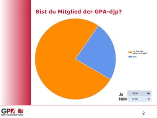 Das Dokument befasst sich mit der gpa-djp und deren Netzwerk 'br:next', das spezifisch auf die Bedürfnisse junger Betriebsrätinnen ausgerichtet ist. Es untersucht die Zufriedenheit, Nutzung und Themen von Veranstaltungen sowie die Teilnahmebereitschaft an gewerkschaftlichen Veranstaltungen. Die Umfrageergebnisse zeigen Interessen an rechtlichen Informationen, Kommunikation und frauenrelevanten Themen.