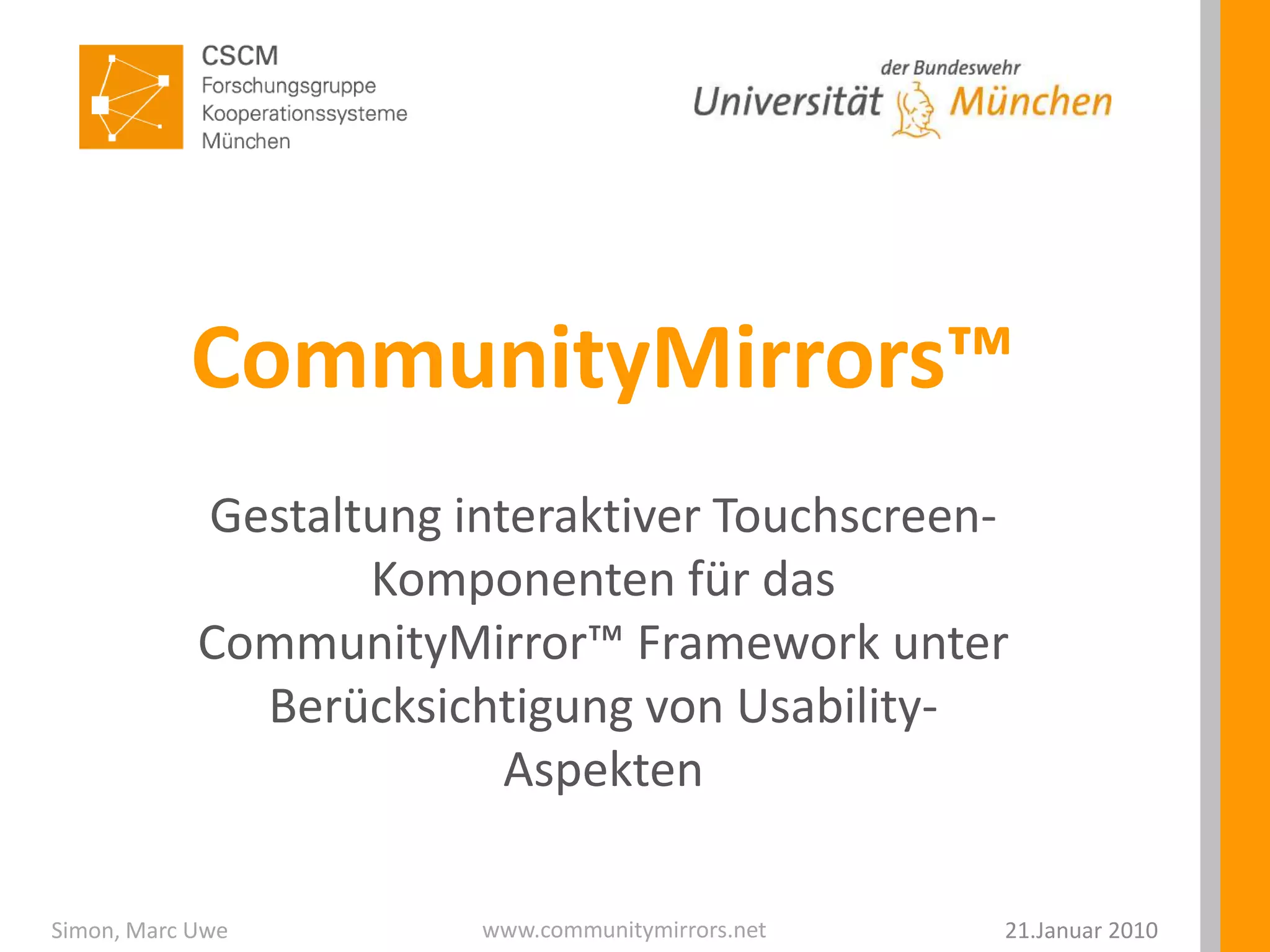 Das Dokument beschreibt die Gestaltung interaktiver Touchscreen-Komponenten für das CommunityMirrorTM-Framework, wobei die Benutzerfreundlichkeit im Vordergrund steht. Ziel ist die Entwicklung eines generischen, erweiterbaren Buttongenerators und die Gestaltung neuer, ansprechender Panels. Außerdem werden Ergebnisse von Feldtests und Usability-Studien präsentiert, die auf häufige Missverständnisse bei der Interaktion hinweisen.