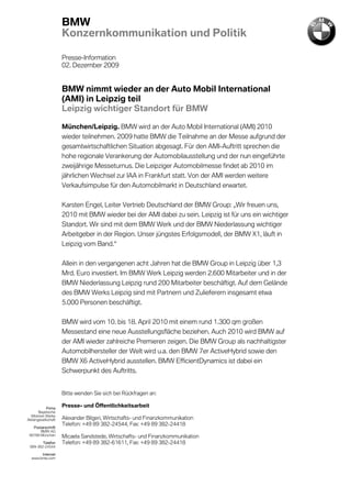 BMW nimmt 2010 wieder an der Auto Mobil International (AMI) in Leipzig teil, nachdem die Teilnahme 2009 wegen der wirtschaftlichen Lage abgesagt wurde. Die Veranstaltung wird im jährlichen Wechsel zur IAA in Frankfurt stattfinden und soll Verkaufsimpulse für den deutschen Automobilmarkt liefern. BMW zeigt auf der Messe mehrere Premieren, darunter den BMW 7er ActiveHybrid und BMW X6 ActiveHybrid, und betont die Bedeutung des Standorts Leipzig für das Unternehmen.