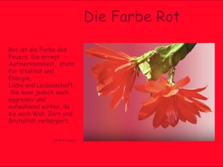 Das Dokument beschreibt die Bedeutungen und Wirkungen verschiedener Farben auf Menschen, einschließlich Rot, Orange, Gelb, Cyan, Blau, Magenta, Violett, Grün, Weiß, Grau und Schwarz. Jede Farbe wird mit positiven und negativen Assoziationen in Verbindung gebracht, die von Vitalität und Optimismus bis hin zu Aggressivität und Langeweile reichen. Die Farbpsychologie bietet Einblicke in emotionale Reaktionen und gesellschaftliche Wahrnehmungen der Farben.