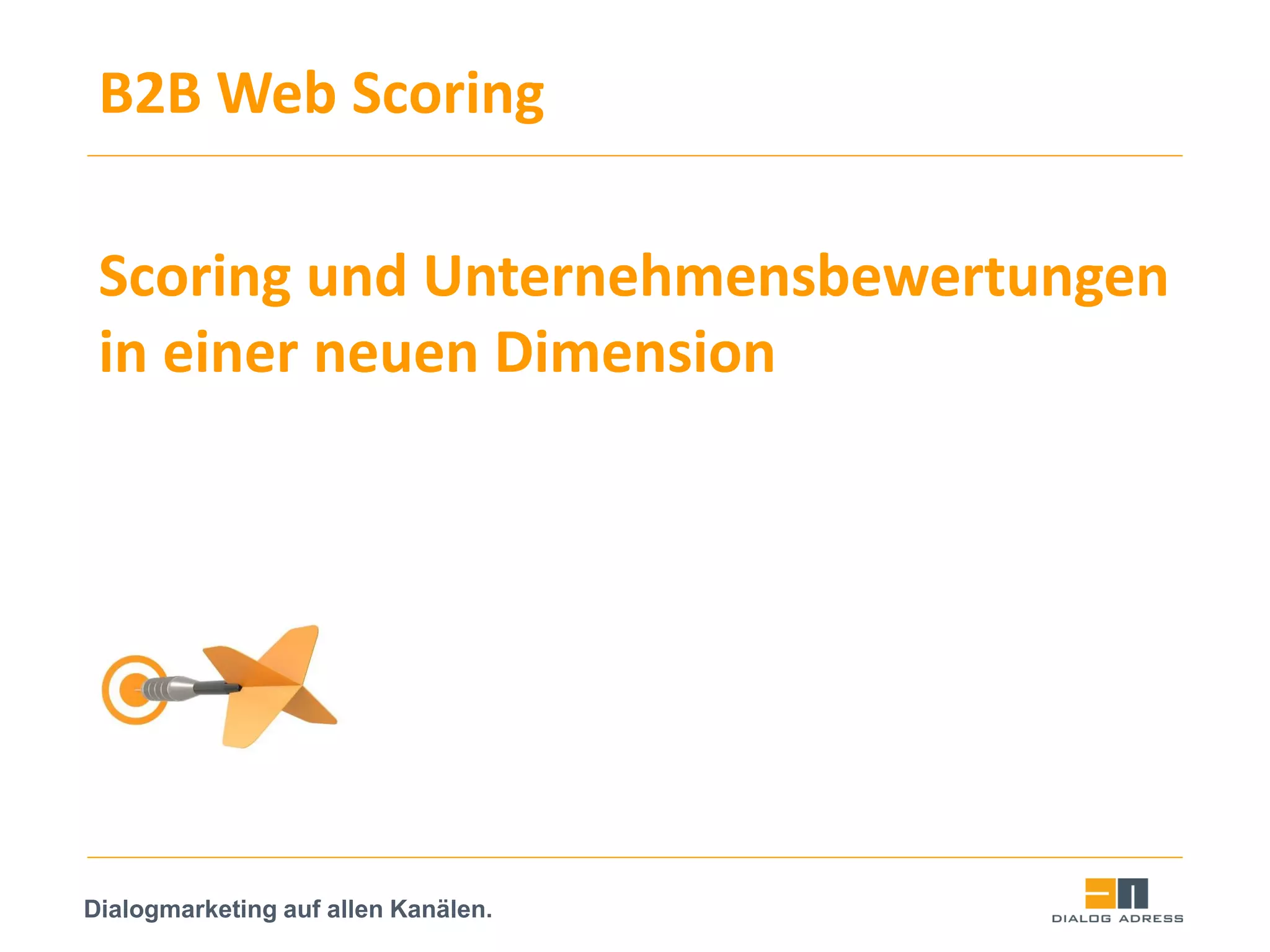 Das Dokument beschreibt B2B Web Scoring als innovatives Werkzeug zur Kundenanalyse und Neukundengewinnung durch die Verknüpfung umfangreicher Unternehmensdaten und Keywords. Es erklärt den Prozess der Analyse bestehender Kundenprofile, um potenzielle Neukunden gezielt anzusprechen und Umsatzchancen zu optimieren. Darüber hinaus hebt es die Vorteile des Dialogmarketings hervor, darunter Kostensenkung, Zeitoptimierung und eine effektive Kundenansprache.