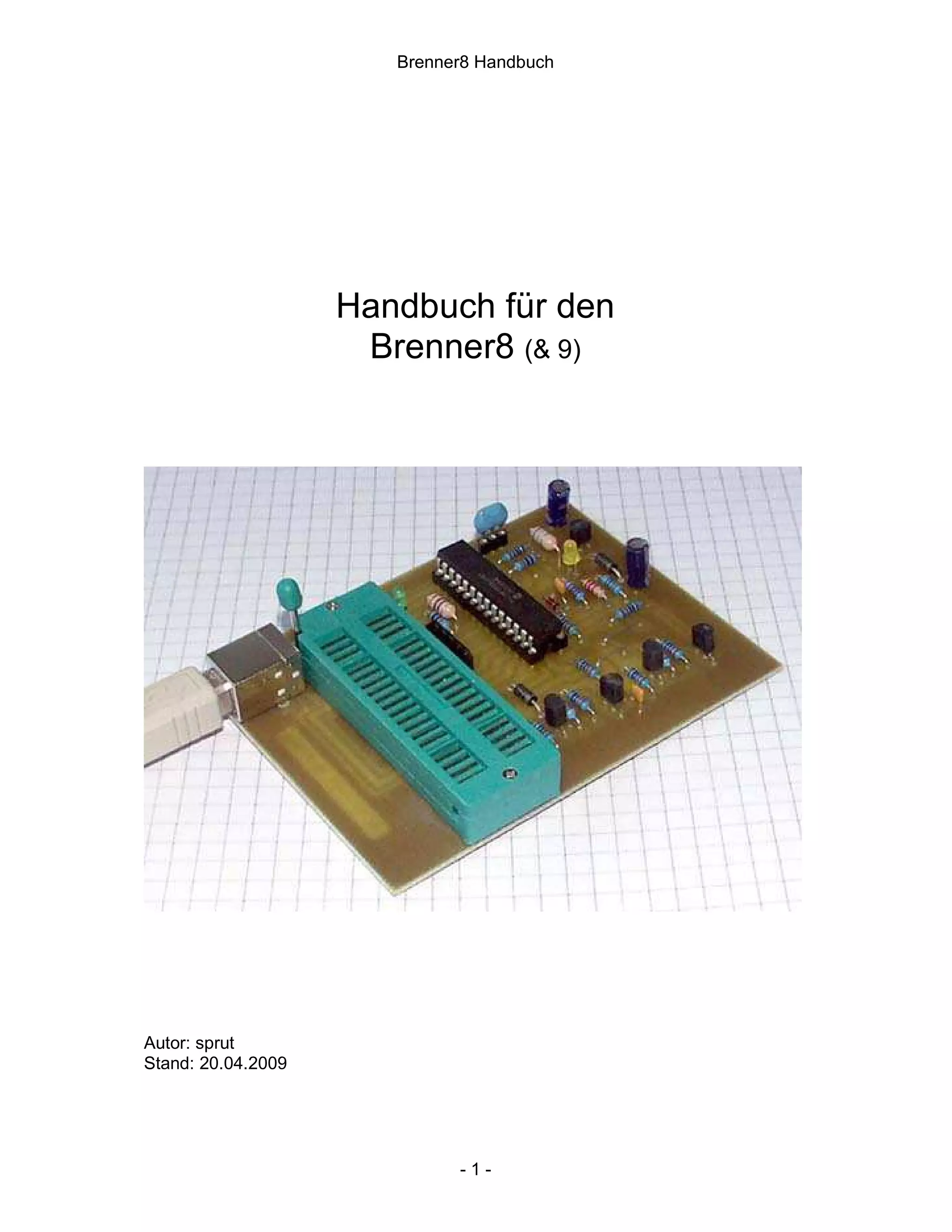 Das Dokument ist ein Handbuch für die Brenner8 und Brenner9, die zum Programmieren von PIC-Microcontrollern verwendet werden. Es enthält detaillierte Informationen zur Hardwarestruktur, Nutzung, Installation und Kalibrierung sowie Anleitungen zur Verwendung der Software Us-burn für Windows und Linux. Zudem werden verschiedene Versionen und Revisionen der Brenner sowie deren technische Spezifikationen erläutert.