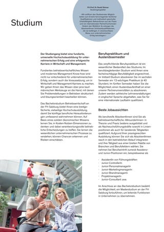 Der Bachelorstudiengang Betriebswirtschaft an der FH Salzburg bietet eine praxisnahe Hochschulausbildung mit Schwerpunkten in verschiedenen Bereichen wie Controlling, Human Resource Management, Logistik und Marketing. Die Studierenden absolvieren Pflichtpraktika und können internationale Erfahrungen sammeln, während sie auf eine Karriere in Management und Betriebswirtschaft vorbereitet werden. Nach dem Bachelorabschluss besteht die Möglichkeit, ein Masterstudium zu verfolgen, um sich für leitende Funktionen zu qualifizieren.