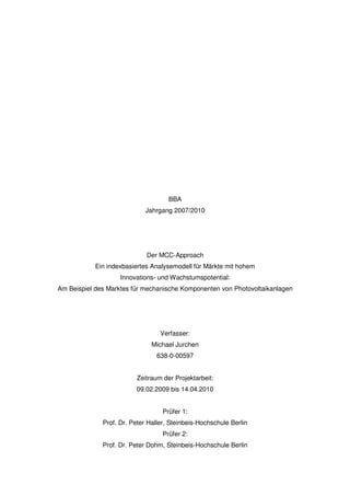 Die Bachelorarbeit von Michael Jurchen beschäftigt sich mit dem MCC-Ansatz als indexbasiertem Analysemodell für Märkte mit hohem Innovations- und Wachstumspotenzial, speziell im Bereich der mechanischen Komponenten von Photovoltaikanlagen. Ziel ist es, eine Checkliste zur Beurteilung der Marktattraktivität zu entwickeln, die als Entscheidungshilfe für einen Markteintritt dienen soll. Die Arbeit untersucht verschiedene Kriterien der Marktanalyse, um Unternehmen bei der Einschätzung von Risiken und Chancen zu unterstützen.