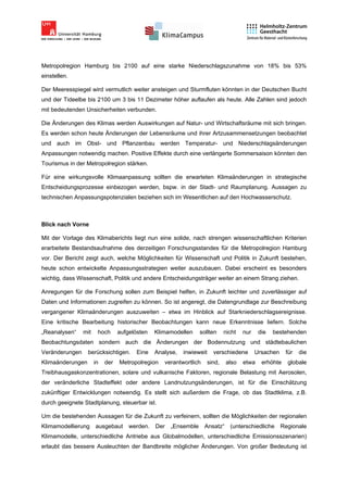 Der "Klimabericht für die Metropolregion Hamburg" bietet eine umfassende Wissensgrundlage zu den Auswirkungen und Risiken des Klimawandels in der Region und behandelt verschiedene Bereiche wie Landwirtschaft, Tourismus und Küstenschutz. Mit Temperaturen, die in den letzten 100 Jahren um etwa 1 °C gestiegen sind, und einem prognostizierten Anstieg von bis zu 4,7 °C bis 2100, zeigt der Bericht die Notwendigkeit strategischer Anpassungen auf. Zudem wird betont, dass zukünftige Forschung und politische Strategien entscheidend sind, um die Herausforderungen des Klimawandels in der Metropolregion zu bewältigen.