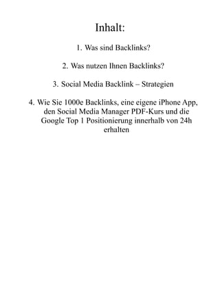 Das Seminar von Soeren Gelder behandelt die Bedeutung von Backlinks für die Sichtbarkeit von Webseiten im Internet. Es werden Strategien vorgestellt, wie man durch Social Media und gezielte Posts Backlinks generieren kann, um somit den Traffic und die Popularität der eigenen Seite zu steigern. Zudem wird ein professioneller Service angeboten, der in kurzer Zeit tausende von Backlinks erstellt, inklusive Bonusangebote zur Erstellung einer iPhone-App und zur Erreichung einer Top-Position bei Google.
