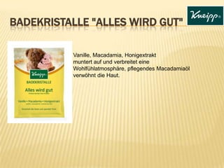 Die Kneipp® Badekristalle "Alles wird gut" sorgen mit Vanille, Macadamia und Honigextrakt für eine angenehme Wohlfühlatmosphäre und pflegen die Haut. Das Verwöhnset und die Badeöle, wie das "Schönheitsgeheimnis", bieten Möglichkeiten für spürbar glatte Haut und luxuriöse Entspannung. Bei Fragen zu Produkten oder Inhaltsstoffen steht die Kneipp Schweiz GmbH über eine kostenlose Infoline und E-Mail zur Verfügung.