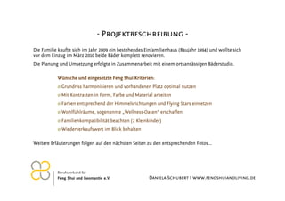 Das Dokument beschreibt die Feng Shui-konforme Neugestaltung der Bäder einer Familie in Norderstedt, die 2009 ein Einfamilienhaus erworben und 2010 renoviert haben. Die Planung berücksichtigte Harmonisierung des Grundrisses, Farb- und Materialkontraste sowie die Schaffung von Wohlfühlräumen unter Berücksichtigung der Familienbedürfnisse und zukünftigen Wiederverkaufswert. Dabei wurden spezifische Feng Shui-Prinzipien, einschließlich der Ausrichtung und Elemente, in die Gestaltung integriert.