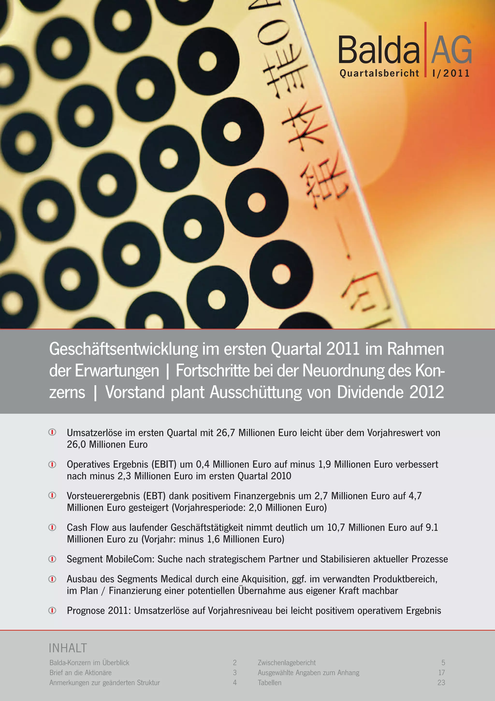 Der Balda-Konzern konnte im ersten Quartal 2011 einen Umsatz von 26,7 Millionen Euro erzielen, was eine leichte Steigerung im Vergleich zum Vorjahreszeitraum bedeutet. Das operative Ergebnis verbesserte sich ebenfalls, jedoch bleibt die Zufriedenheit mit dem operativen Geschäft hinter den Erwartungen zurück, insbesondere im Segment Mobilecom, während die anderen Segmente ihre Ziele erreichten. Der Vorstand plant eine Dividendenausschüttung für 2012 und verfolgt eine Neuausrichtung durch mögliche Akquisitionen im Bereich Medical sowie strategische Partnerschaften im Mobilecom-Segment.