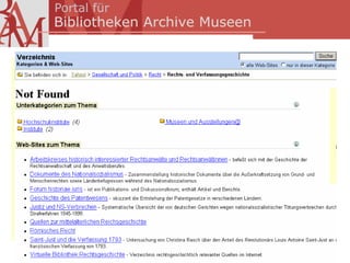 Das Dokument beschreibt ein gemeinsames Internetportal für Bibliotheken, Archive und Museen in Baden-Württemberg, das als heterogene Metasuchmaschine konzipiert ist. Es bietet umfassende Suchmöglichkeiten für bibliothekarische, archivische und museumsspezifische Inhalte und thematisiert die Herausforderungen interdisziplinärer Recherche sowie unterschiedliche Erschließungsmethoden. Abschließend wird festgestellt, dass trotz technischer Lösungen und verbesserter Rechercheergebnisse eine perfekte Recherche weiterhin utopisch bleibt.