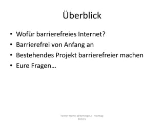 Die Präsentation von Domingos de Oliveira zum Thema barrierefreies Internet beleuchtet die Notwendigkeit und Vorteile der Barrierefreiheit für alle Nutzer, insbesondere für Menschen mit Behinderungen. Sie empfiehlt Werkzeuge und Methoden zur Optimierung bestehender Projekte zur Verbesserung der Barrierefreiheit, ohne umfangreiche Relaunches durchzuführen, sowie die Integration von Zugangstests mit Nutzern, die Behinderungen haben. Abschlussinformationen und Ressourcen zu Accessibility-Tools und Checklisten für Entwickler werden ebenfalls bereitgestellt.