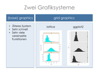 Das Dokument behandelt die verschiedenen Grafiksysteme in R, insbesondere 'base graphics' und 'grid graphics'. Es beschreibt Funktionen zur Erstellung komplexer Grafiken und die Bedeutung von grafischen Parametern, um die Darstellung zu optimieren. Zudem werden einige spezifische Anwendungen und Beispiele für Histogramme und Streudiagramme gegeben, und es wird erläutert, wie man Grafiken in Dateien speichert.