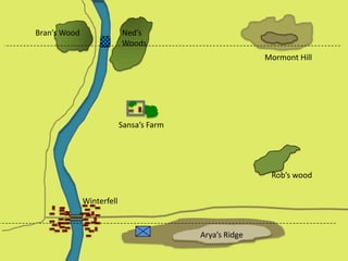 Das Dokument listet verschiedene geografische Orte und Besitztümer im Zusammenhang mit der Geschichte von Westeros, einschließlich Bran's Wood, Ned's Woods und Winterfell. Es scheint sich um eine Aufzählung wichtiger Orte, die in der Handlung von 'Game of Thrones' relevant sind, zu handeln. Die genannten Orte sind mit verschiedenen Charakteren verknüpft, was auf deren Bedeutung hinweist.