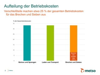 Das Dokument beschreibt die Verbesserung der Wirtschaftlichkeit im Brecherbetrieb durch die Optimierung von Brechkammern und den Einsatz hochwertiger Verschleißteile von Metso. Hauptziele sind die Minimierung von Stillstandzeiten, die Erhöhung der Lebensdauer der Brechwerkzeuge und die Gewährleistung einer gleichbleibenden Qualität. Anhand eines Kundenbeispiels wird die erhöhte Lebensdauer und Effizienz der Metso-Lösungen im Vergleich zu anderen Herstellern verdeutlicht.
