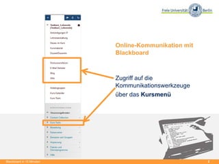 Das Dokument behandelt die Nutzung von Blackboard zur effizienten Kommunikation zwischen Lehrenden und Studierenden. Es bietet einen Überblick über verschiedene Kommunikationswerkzeuge wie Ankündigungen, E-Mail und Diskussionsforen und erklärt deren Funktionen und Einsatzmöglichkeiten. Zudem werden Tipps für die Anwendung dieser Tools in Vorlesungen und Seminaren gegeben.