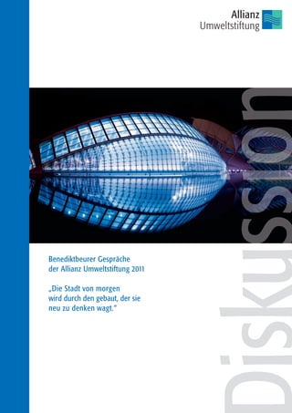 Die benediktbeurer Gespräche der Allianz Umweltstiftung 2011 thematisierten die Zukunft urbaner Räume mit dem Motto "Die Stadt von morgen wird durch den gebaut, der sie neu zu denken wagt." Experten aus verschiedenen Bereichen diskutierten die Herausforderungen der Verstädterung und die Notwendigkeit, menschliche Grundbedürfnisse in die Stadtplanung zu integrieren. Ziel der Gespräche ist es, ein nachhaltiges, lebenswertes Umfeld für künftige Generationen zu fördern, wobei die städtische Entwicklung geschlossen und inklusiv gestaltet werden soll.