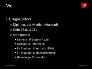 Der Workshop zu ActionScript 3, geleitet von Gregor Sklorz, richtet sich an Einsteiger und bietet eine umfassende Einführung in die Grundlagen sowie vertiefte Themen wie XML und Socket-Verbindungen. An den zwei Kurstagen lernen die Teilnehmer die Entwicklung einfacher Spiele und die Struktur von ActionScript-Anwendungen. Zudem werden die historische Entwicklung von Flash und relevante Tools wie die Flash IDE behandelt.