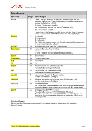 Das Dokument beschreibt die Struktur und die Datenfelder des BC-Bankenstamms, der Informationen über Banken und Finanzinstitute in der Schweiz enthält. Jede Bank wird durch eine eindeutige BC-Nummer identifiziert, und es werden verschiedene Gruppierungen und Identifikatoren vorgestellt, die zur Kategorisierung und Verwaltung dieser Institutionen dienen. Wichtige Details über die Teilnahme an Zahlungsdienstleistungen sowie spezifische Adress- und Kontoinformationen werden ebenfalls bereitgestellt.