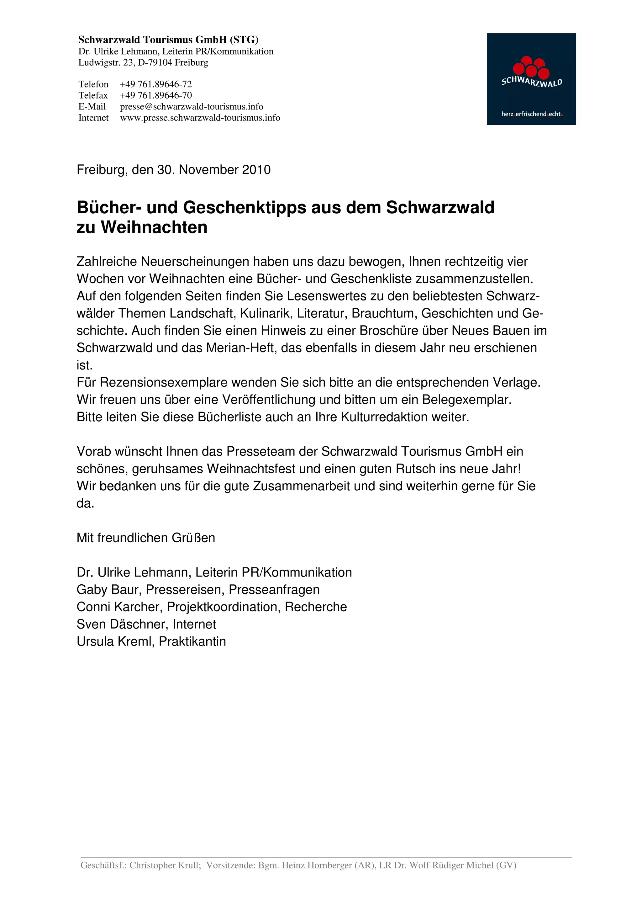 Die Schwarzwald Tourismus GmbH hat eine Liste von Geschenk- und Buchempfehlungen für Weihnachten zusammengestellt, die vier Wochen vor dem Fest veröffentlicht wurde. Die Empfehlungen umfassen verschiedene Themen wie Landschaft, Kulinarik und Lokalgeschichte, und die Liste enthält zudem Informationen zu Rezensionsanfragen und Publikationswünschen. Das Presseteam wünscht den Lesern ein frohes Weihnachtsfest und ein gutes neues Jahr.