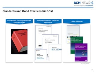 Das Dokument bietet einen umfassenden Überblick über relevante Standards und Vorschriften im Bereich Business Continuity Management (BCM), einschließlich gesetzlicher Anforderungen und internationaler Normen. Es behandelt spezifische Regelungen wie das Aktiengesetz und die Mindestanforderungen für das Risikomanagement (MaRisk) sowie verschiedene BCM-Standards wie BS 25999 und ISO 22301. Des Weiteren werden die Inhalte, Veröffentlichungen und Zertifizierungsmöglichkeiten der verschiedenen Standards skizziert.