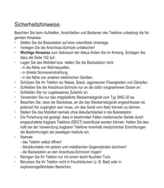 Die Bedienungsanleitung für das VTech Sinus A 302 Telefon enthält wichtige Sicherheitshinweise, die beim Aufstellen und Bedienen des Geräts zu beachten sind, wie den Schutz vor Wärme, Feuchtigkeit und anderen elektrischen Geräten. Es wird empfohlen, das Telefon nur mit dem mitgelieferten Zubehör zu verwenden und sicherzustellen, dass die Steckdose jederzeit zugänglich ist. Die Anleitung bietet außerdem detaillierte Informationen zur Inbetriebnahme, Nutzung und Pflege des Telefons.
