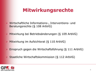 Das Dokument behandelt die Mitwirkungsrechte des Betriebsrates in wirtschaftlichen Angelegenheiten gemäß dem Arbeitsverfassungsgesetz (ArbVG). Es beschreibt die Rechte auf Informationen, Interventionen und Beratungen, die Mitwirkung bei Betriebsänderungen sowie die Einspruchsmöglichkeiten gegen wirtschaftliche Maßnahmen. Zusätzlich wird die Rolle des Betriebsrates im Aufsichtsrat und die Möglichkeit zur Einleitung von Schlichtungsverfahren hervorgehoben.