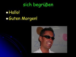 Das Dokument bietet eine Einführung in grundlegende Begrüßungen, Vorstellungen und Verabschiedungen in deutscher Sprache. Beispiele umfassen verschiedene Begrüßungen wie 'Hallo', 'Guten Morgen' und 'Tschüss'. Es zeigt auch, wie man sich vorstellt und nach dem Befinden fragt.