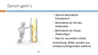 Der Vortrag von Domingos de Oliveira behandelt die Rolle von behinderten Charakteren im Storytelling, betont deren Potenzial als Haupt- oder Nebenfiguren und warnt vor Klischees. Behinderungen sollten in der Handlung relevant sein und realistisch dargestellt werden, um stereotype Darstellungen und moralische Überlegenheit zu vermeiden. Der Autor plädiert für eine differenzierte und menschliche Darstellung von behinderten Figuren, die nicht auf ihre Behinderung reduziert werden sollten.