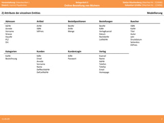 Das Dokument beschreibt die Modellierung eines relationalen Datenbankmodells, das verschiedene Entitätstypen wie Adressen, Artikel, Bestellungen und Kunden umfasst. Es enthält Informationen zu Attributen, funktionalen Abhängigkeiten und den Normalisierungsprozess bis zur dritten Normalform. Zudem wird auf die referentielle Integrität eingegangen, die sicherstellt, dass Fremdschlüssel in Detailtabellen nur gültige Werte aus den entsprechenden Mastertabellen annehmen können.