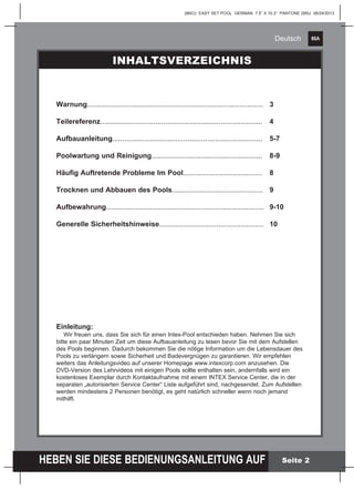 Das Dokument ist ein Benutzerhandbuch für den Intex Easy Set Pool, das wichtige Sicherheitshinweise und Anweisungen zur Installation und Wartung des Pools enthält. Vor der Nutzung des Pools sollen alle Anweisungen genau gelesen und befolgt werden, um die Sicherheit zu gewährleisten. Es werden auch Richtlinien für den Standort, die Vorbereitung des Bodens und den Umgang mit dem Pool gegeben, um Verletzungen und Schäden zu vermeiden.