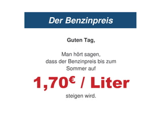 Das Dokument thematisiert den steigenden Benzinpreis und schlägt vor, als Konsumenten gemeinsam gegen die Ölgesellschaften vorzugehen, um Druck auf die Preise auszuüben. Der Autor argumentiert, dass durch eine koordinierte Aktion, bei der viele Menschen gleichzeitig kein Benzin kaufen, die großen Ölgesellschaften gezwungen werden könnten, ihre Preise zu senken. Es wird ein Plan diskutiert, um eine breitere Reichweite zu erzielen und viele Unterstützer zu mobilisieren.