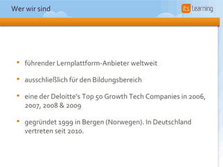 Die Lernplattform itslearning, gegründet 1999 in Norwegen und seit 2010 in Deutschland aktiv, ist ein führender Anbieter im Bildungsbereich mit 180 Mitarbeitern und einer durchschnittlichen Verfügbarkeit von 99,9%. Die Plattform bietet eine offene Architektur zur Integration von externen Tools sowie individuelle Lernpläne und unterstützt eine Vielzahl von Standards für barrierefreies Lernen. Sie gewährleistet Datenschutz, professionelle Datensicherheit und ermöglicht durch Schulungen schnellen und effektiven Zugang zur Anwendung innerhalb von 24 Stunden nach Vertragsabschluss.