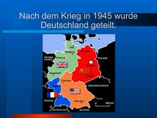 Berlin, die Hauptstadt Deutschlands, wurde nach dem Zweiten Weltkrieg 1945 geteilt, was 1961 zur Errichtung der Mauer führte, die die Stadt in Ost- und Westberlin splittete. Wichtige Sehenswürdigkeiten in Berlin sind unter anderem der Alexanderplatz, das Brandenburger Tor und der Fernsehturm. Darüber hinaus zählen auch Checkpoint Charlie, die Gedächtniskirche und die East Side Gallery zu den bekannten Attraktionen der Stadt.