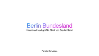Berlin ist die Hauptstadt und größte Stadt Deutschlands mit einer Fläche von 891 km² und 3.392.000 Einwohnern. Das Stadtwappen zeigt einen aufgerichteten schwarzen Bären und das Brandenburger Tor wurde 1791 fertiggestellt, während der Fernsehturm 368 m hoch ist. Berlin wurde nach dem Zweiten Weltkrieg in Ost- und Westberlin geteilt, wobei die Mauer 1961 erbaut und 1989 abgerissen wurde.