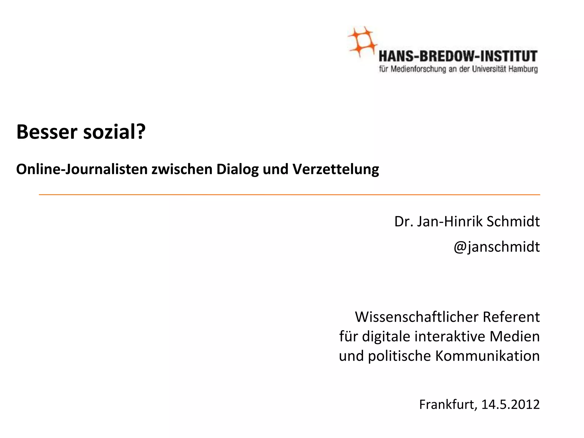 Das Dokument untersucht die Rolle von sozialen Medien im Online-Journalismus, insbesondere die Veränderungen in der Kommunikation zwischen Journalisten und ihrem Publikum. Es wird festgestellt, dass soziale Medien neue Formen der Öffentlichkeit schaffen und die Wirksamkeit von Journalismus durch verstärkte Publikumsbeteiligung und Dialog erhöht werden kann, jedoch auch Herausforderungen wie Überlastung und die Gefahr der Verzettelung mit sich bringen. Letztlich ist eine Neudefinition journalistischer Praktiken erforderlich, um den sich wandelnden Anforderungen der Informationsgesellschaft gerecht zu werden.