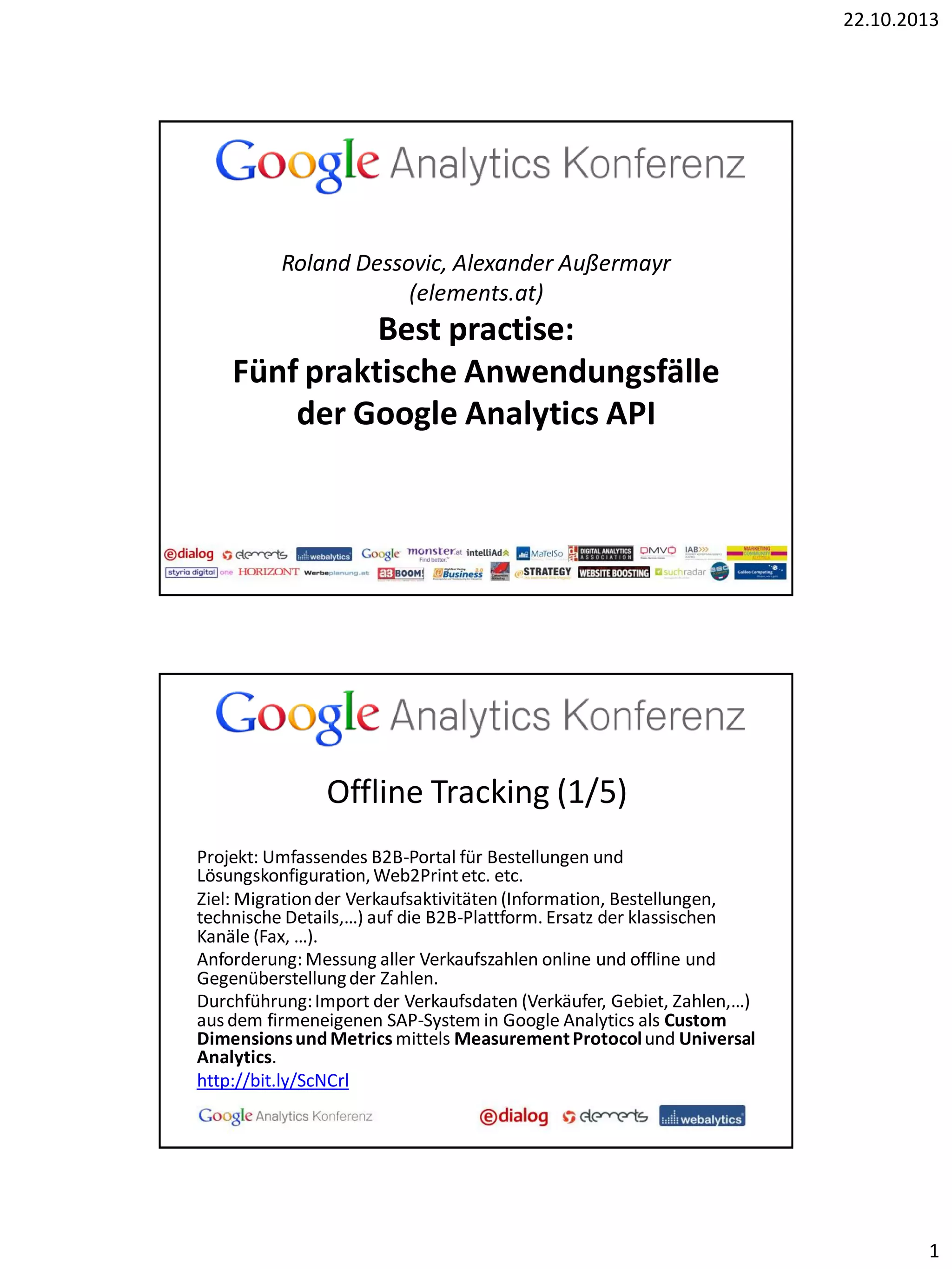 Das Dokument beschreibt fünf Anwendungsfälle zur Implementierung der Google Analytics API für Offline-Tracking und Reporting, einschließlich der Migration von Verkaufsaktivitäten auf eine B2B-Plattform und der Integration von KPIs in ein Content-Management-System. Weitere Projekte umfassen die Automatisierung von Spezialberichten, die Erstellung eines SEO-Reporting-Systems und ein Management-Dashboard zur Anzeige von Echtzeitdaten. Ziel ist es, die Berichterstattung zu vereinfachen und ressourcenschonendere Prozesse zu schaffen.