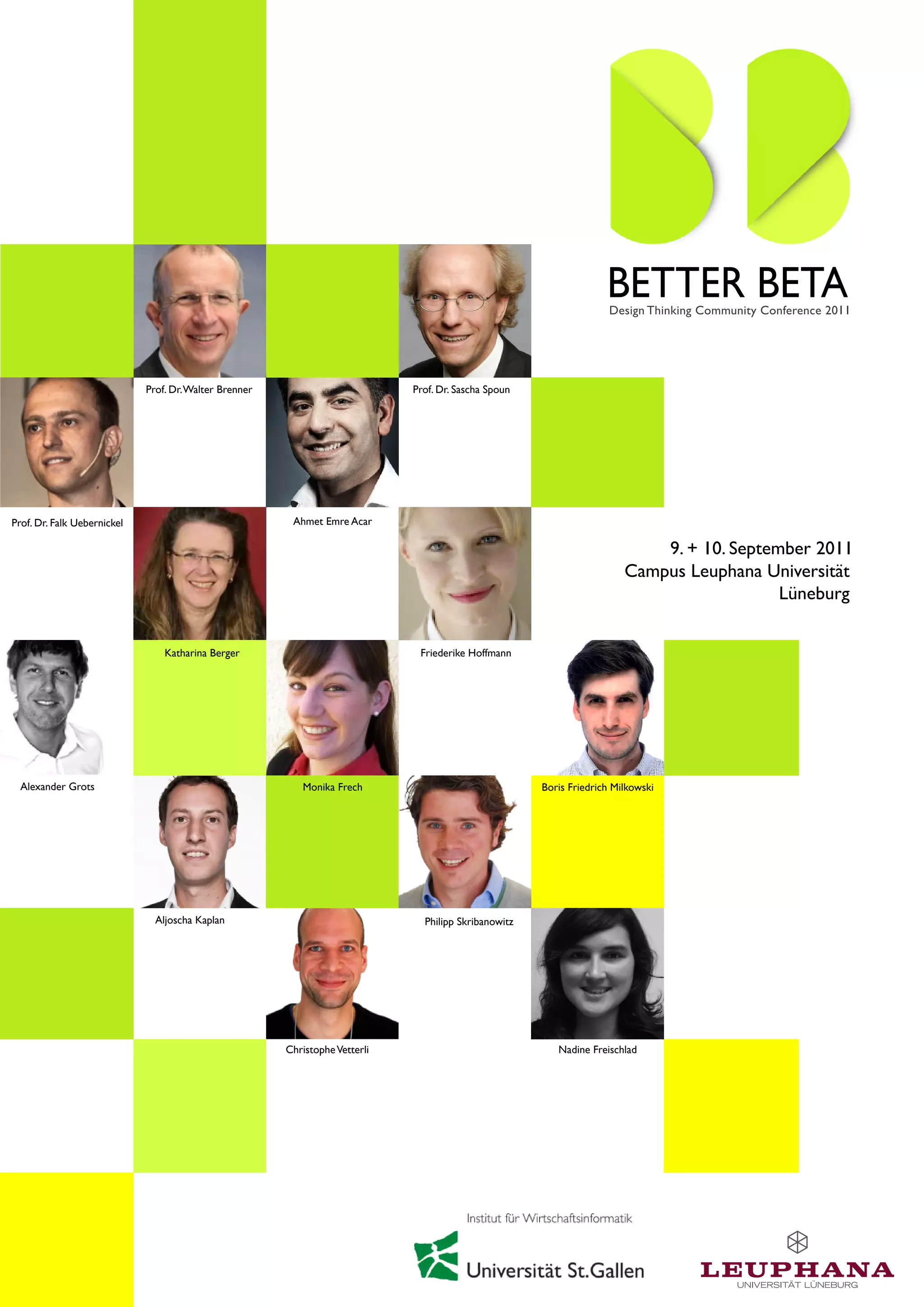 Die Better Beta Design Thinking Conference fand vom 9. bis 10. September 2011 an der Leuphana Universität Lüneburg statt und zielte darauf ab, Teilnehmer in den Design Thinking Prozess einzuführen und innovative Ansätze zu entwickeln. Die Konferenz bot praktische Workshops, die von erfahrenen Moderatoren geleitet wurden, sowie Sessions zu Themen wie Business Model Innovation und Ideation. Teilnehmer hatten die Möglichkeit, ihre Ideen in interdisziplinären Teams zu entwickeln und am Ende der Veranstaltung ihre Prototypen zu präsentieren.
