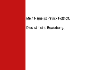 Patrick Potthoff bewirbt sich in unkonventioneller Form und hebt seine umfangreiche Ausbildung und Erfahrung im Marketing und in der Sportkommunikation hervor. Seine Qualifikationen umfassen ein Fachabitur, eine Ausbildung zum Industriekaufmann, ein Bachelorstudium in Betriebswirtschaftslehre mit Schwerpunkt Marketing, sowie berufliche Stationen bei namhaften Unternehmen und Institutionen. Potthoff betont seine Kernkompetenzen und Erfahrungen, die ihn als idealen Kandidaten für eine Position im Marketing qualifizieren.