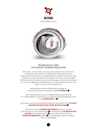 Die dritte Ausgabe von 'Beyond' thematisiert Werkzeuge der internen Kommunikation und die Bedeutung einer klugen Kombination und Umsetzung dieser Instrumente im medienüberfluteten Alltag. Experten und Praktiker diskutieren die Herausforderungen und Chancen der internen Kommunikation, wobei der Flurfunk und neue digitale Plattformen als Möglichkeiten zur Förderung einer offenen Unternehmenskultur hervorgehoben werden. Der Beitrag unterstreicht die Notwendigkeit, Mitarbeiter in Kommunikationsprozesse einzubeziehen und betont, dass trotz der digitalen Transformation, traditionelle Medien wie Mitarbeiterzeitschriften weiterhin wichtig sind, um Identität und Orientierung zu bieten.